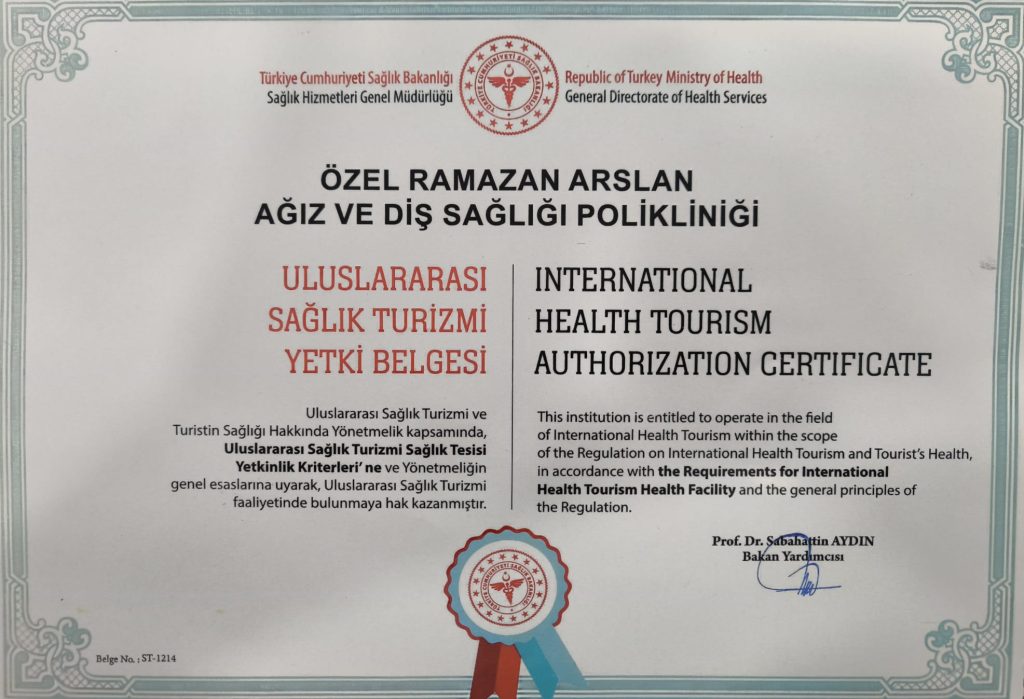 Polikliniğimiz sağlık turizmi yapılması için gerekli olan Uluslararası Sağlık Turizmi Yetki Belgesi’ni Sağlık Bakanlığı’ndan alarak uzun yıllardır sağlık turizmi yapmaktadır.